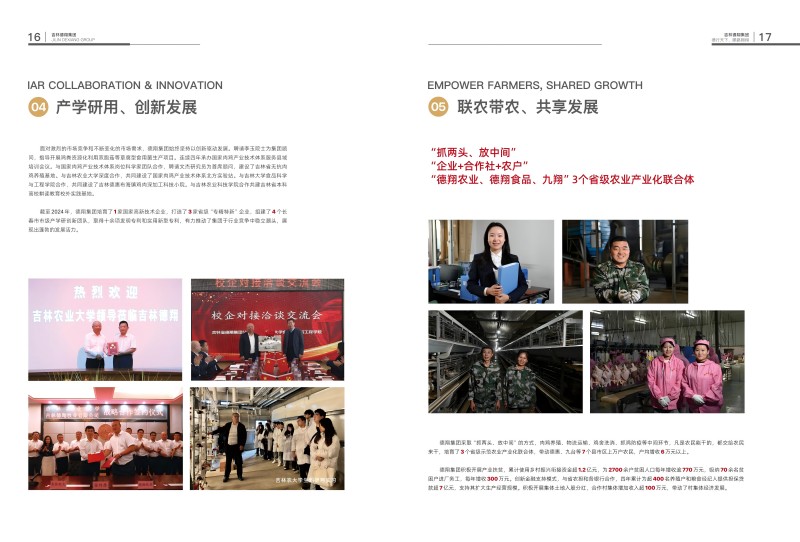 吉林德翔集團(tuán),由德翔牧業(yè)、德翔食品、德翔物流等25家經(jīng)營(yíng)主體組成,主營(yíng)業(yè)務(wù)包括種雞繁育、種蛋孵 化、肉雞飼養(yǎng)、肉雞屠宰、飼料生產(chǎn)、糧食種植、糧食收儲(chǔ)物流等。歷經(jīng)多年艱苦創(chuàng)業(yè),現(xiàn)已發(fā)展成為擁有1家農(nóng)業(yè)產(chǎn)業(yè)化國(guó)家重點(diǎn)龍頭企業(yè)、2家農(nóng)業(yè)產(chǎn)業(yè)化吉林省重點(diǎn)龍頭企業(yè)的貿(mào)工農(nóng)一體化、產(chǎn)加銷一條龍的農(nóng)村一二三產(chǎn)業(yè)融合發(fā)展的典范。德翔集團(tuán)自成立以來(lái)始終堅(jiān)持“扎根農(nóng)村、以工帶農(nóng)、服務(wù)為先、富民為本”的經(jīng)營(yíng)理念,以工業(yè)的經(jīng)營(yíng)理念謀劃農(nóng)業(yè),圍繞種養(yǎng)加一條龍,現(xiàn)代糧食倉(cāng)儲(chǔ)物流兩大業(yè)務(wù)項(xiàng)目,投資建立或整合相關(guān)產(chǎn)業(yè)環(huán)節(jié),建立全鏈條的產(chǎn)業(yè)優(yōu)勢(shì),通過(guò)建立糧食物流公司、飼料公司、農(nóng)牧專業(yè)合作社、屠宰加工廠等有效實(shí)施縱向一體化經(jīng)營(yíng),通過(guò)“公司+基地+家庭農(nóng)場(chǎng)+農(nóng)戶”形式把種養(yǎng)農(nóng)戶納入產(chǎn)業(yè)鏈的種植和飼養(yǎng)環(huán)節(jié),從而實(shí)現(xiàn)農(nóng)業(yè)生產(chǎn)的標(biāo)準(zhǔn)化、規(guī)模化、集約化、商品化。