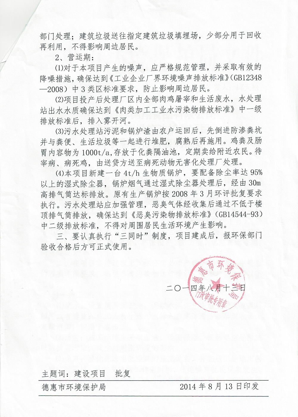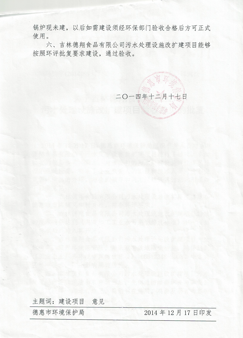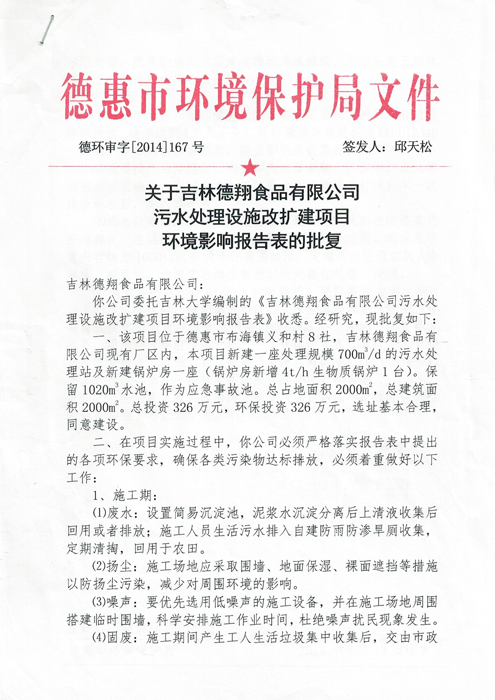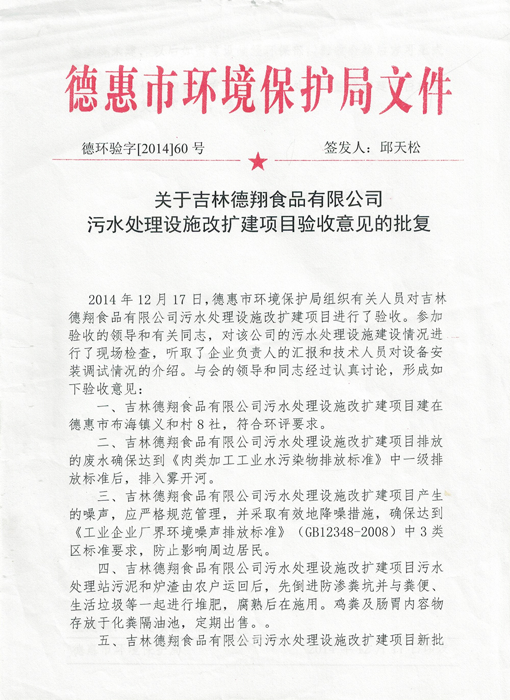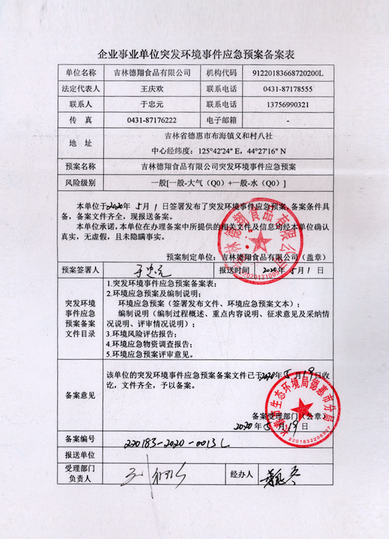 吉林德翔食品有限公司是肉雞一條龍產(chǎn)業(yè),嚴(yán)格按照環(huán)保三同時(shí)要求進(jìn)行設(shè)計(jì)、施工和投入使用,環(huán)境影響評價(jià)報(bào)告及批復(fù)手續(xù)、環(huán)??⒐を?yàn)收及批復(fù)手續(xù)、排污許可手續(xù)健全、合法有效,建立健全突發(fā)環(huán)境事件應(yīng)急預(yù)案,在環(huán)保部門均已備案。