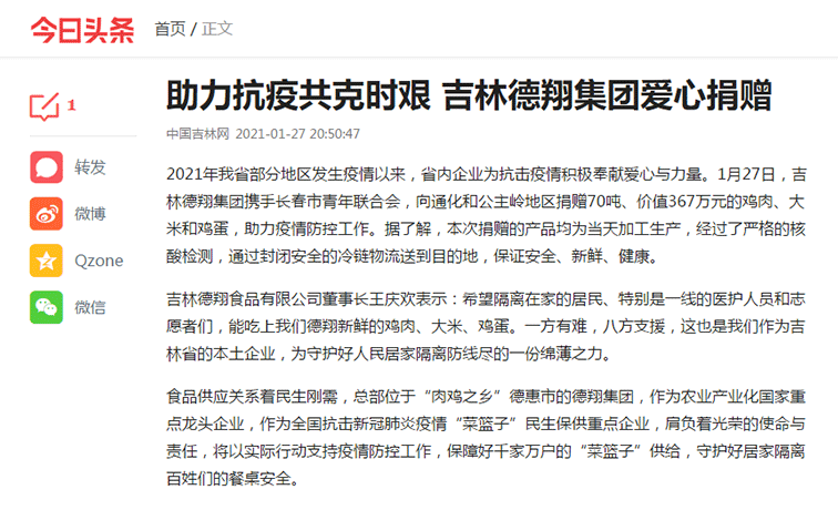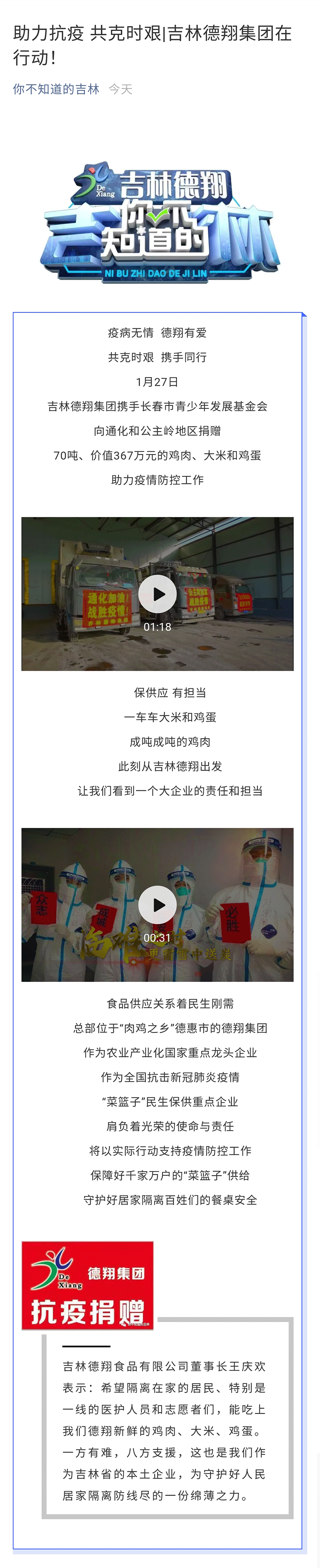 吉林德翔集團,作為農(nóng)業(yè)產(chǎn)業(yè)化國家重點龍頭企業(yè),肩負著光榮的使命與責任,在疫情防控的關(guān)鍵時刻,必須要承擔這一社會責任感,春節(jié)臨近,就地過年是大勢所趨,支援通化市、公主嶺市疫情阻擊戰(zhàn)是應(yīng)盡義務(wù)。1月27日和1月29日兩天,德翔集團向公主嶺市、通化市捐贈大米、雞蛋、雞肉產(chǎn)品共70噸,捐贈物資總價值達367萬元,讓疫區(qū)人民感受到家的溫暖,感受到“年”的氣息。沒有一個冬天不能逾越,沒有一個春天不會到來。相信只要大家眾志成城、堅定信心、精誠團結(jié)、群策群力,就沒有過不去的坎,就一定能打贏這場疫情防控阻擊戰(zhàn)。