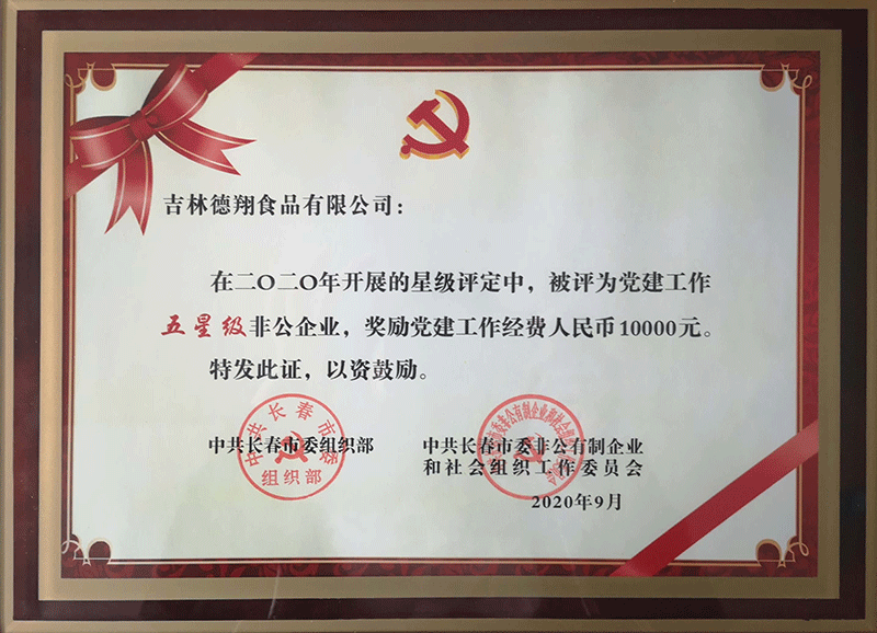 成立食品工業(yè)園黨支部,投入上萬元用于園區(qū)黨支部軟硬件建設(shè)。傾全力把德翔各園區(qū)黨支部建成全市非公企業(yè)黨建工作的“航母”,統(tǒng)領(lǐng)園區(qū)內(nèi)所有非公企業(yè)的黨建和黨員教育管理工作。在德翔總部建立了“黨的建設(shè)辦公室”,還新建立了“打造德翔集團(tuán)公司體驗中心”,開展了“德翔杯”慶祝建黨100周年黨史知識競賽活動。落實(shí)“三會一課”制度,組織各項宣傳和年度評比活動。2019、2020年根據(jù)上級文件要求,開展了非公企業(yè)和社會組織的雙向承諾工作,使集團(tuán)員工了解并掌握雙向承諾的內(nèi)容。通過“定、亮、踐、評”等方式,推動黨建與企業(yè)共同發(fā)展,實(shí)現(xiàn)“黨建強(qiáng)、企業(yè)強(qiáng)”的良好局面。在2020年被長春市委組織部評為“黨建工作五星級非公企業(yè)”。